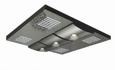 中部U型發(fā)紋底板加簡燈,兩側(cè)輔以鏡面鏤空板的柔光照明設(shè)計(jì)